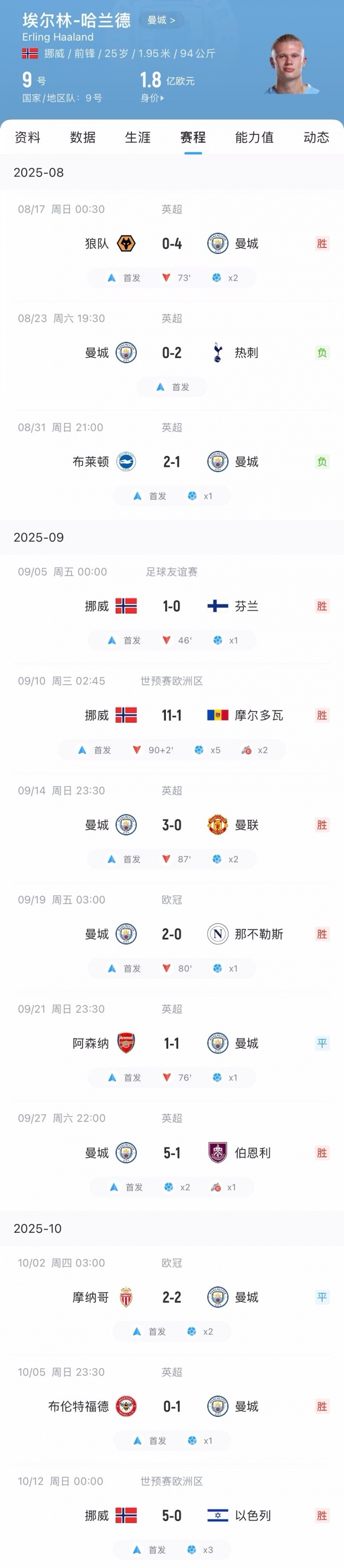 哈兰德本赛季各项赛事代表俱乐部和国家队出战12场,仅对阵热刺时哑火,成绩单为12场21球3助,场均造2球!