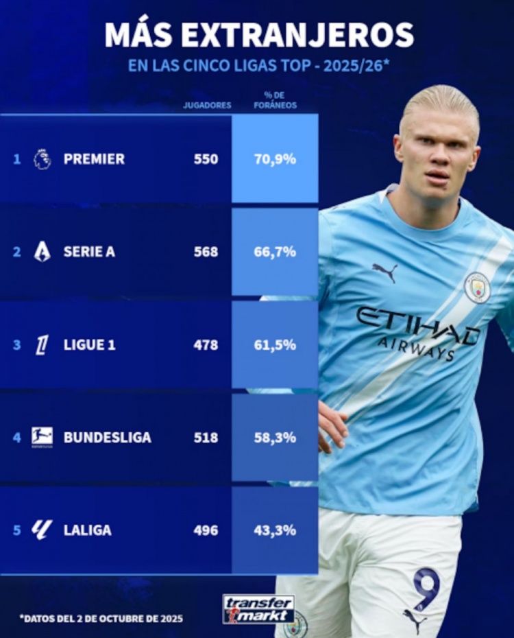 五大联赛外籍球员占比:英超70.9%最高,西甲43.3%最低