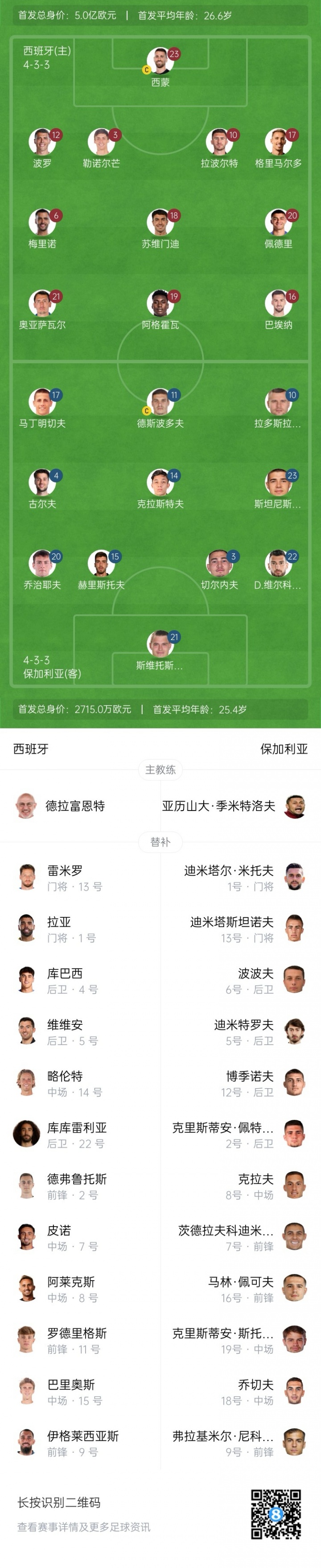 西班牙首发:23-乌奈西蒙、12-波罗、10-拉波尔特、3-勒诺尔芒、17-格里马尔多、18-苏维门迪、20-佩德里、6-梅里诺、16-巴埃纳、21-奥亚萨瓦尔、19-阿格霍瓦