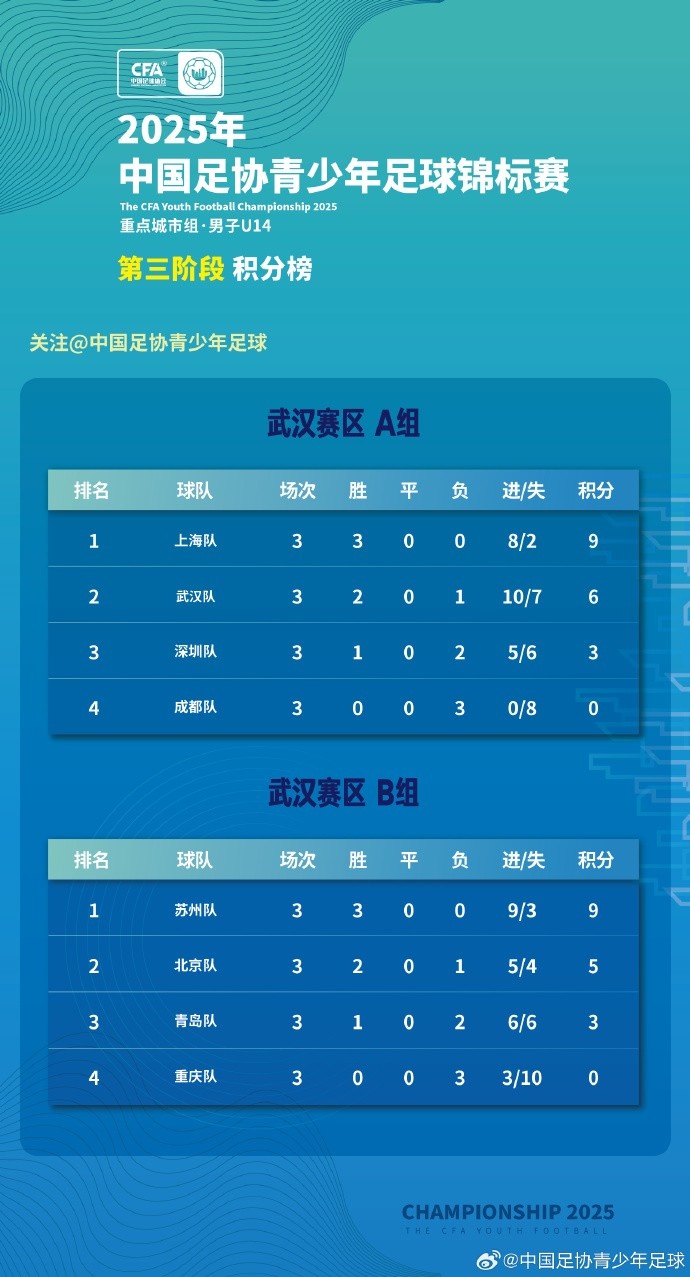 2025年中国足协青少年足球锦标赛重点城市男子U14组第三阶段第3轮赛果+积分榜 ????️