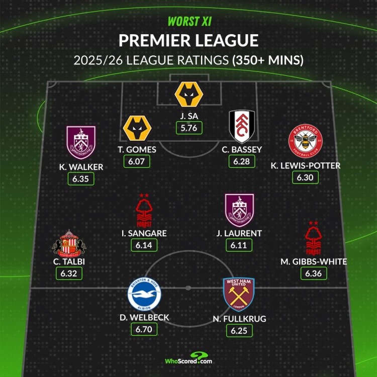 WhoScored本赛季至今英超最差阵容(出场350分钟+):