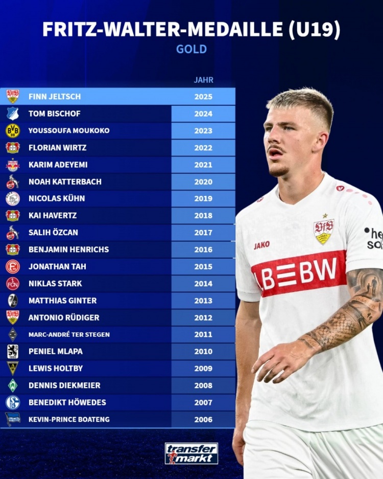 10月17日讯 斯图加特中卫耶尔奇当选德国足协年度最U19最佳新秀,德国转会市场列出了历届德国U19年度最佳新秀的名单。